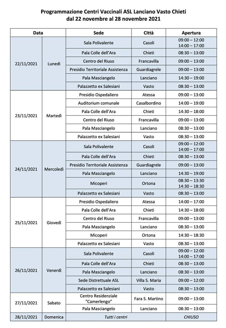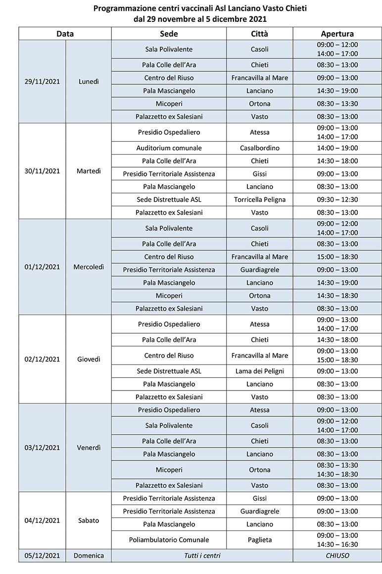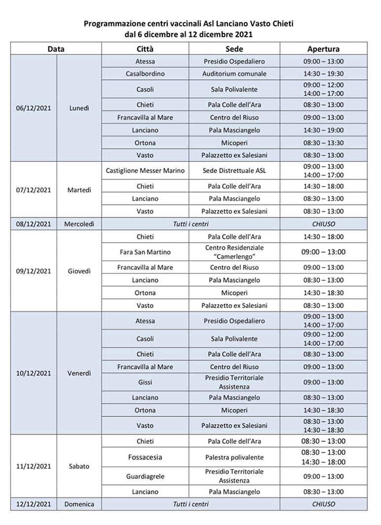 PROGRAMMAZIONE SEDI VACCINALI DAL 6 AL 12 DICEMBRE 2021
