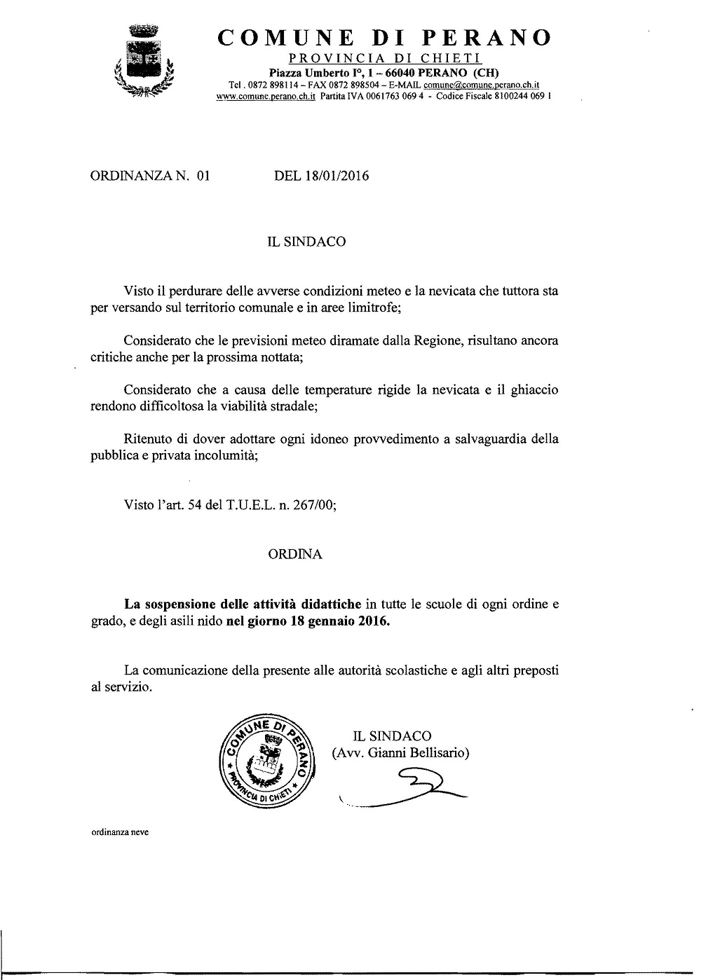 Messaggio di inizio anno del Sindaco Bellisario - 2016